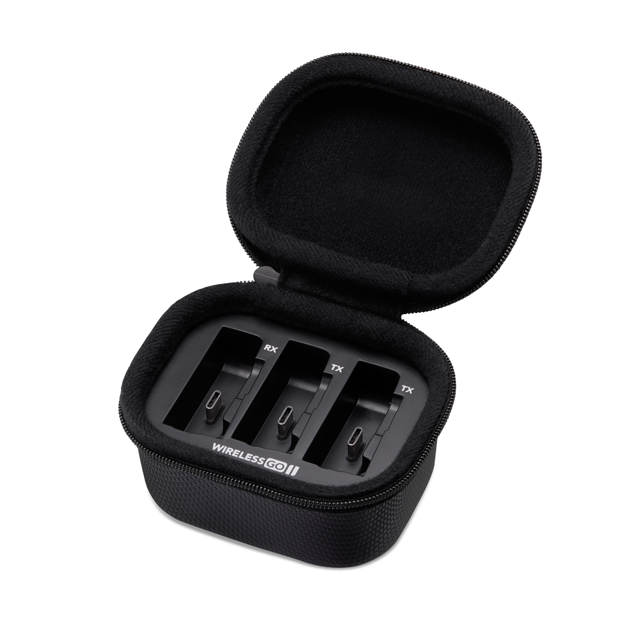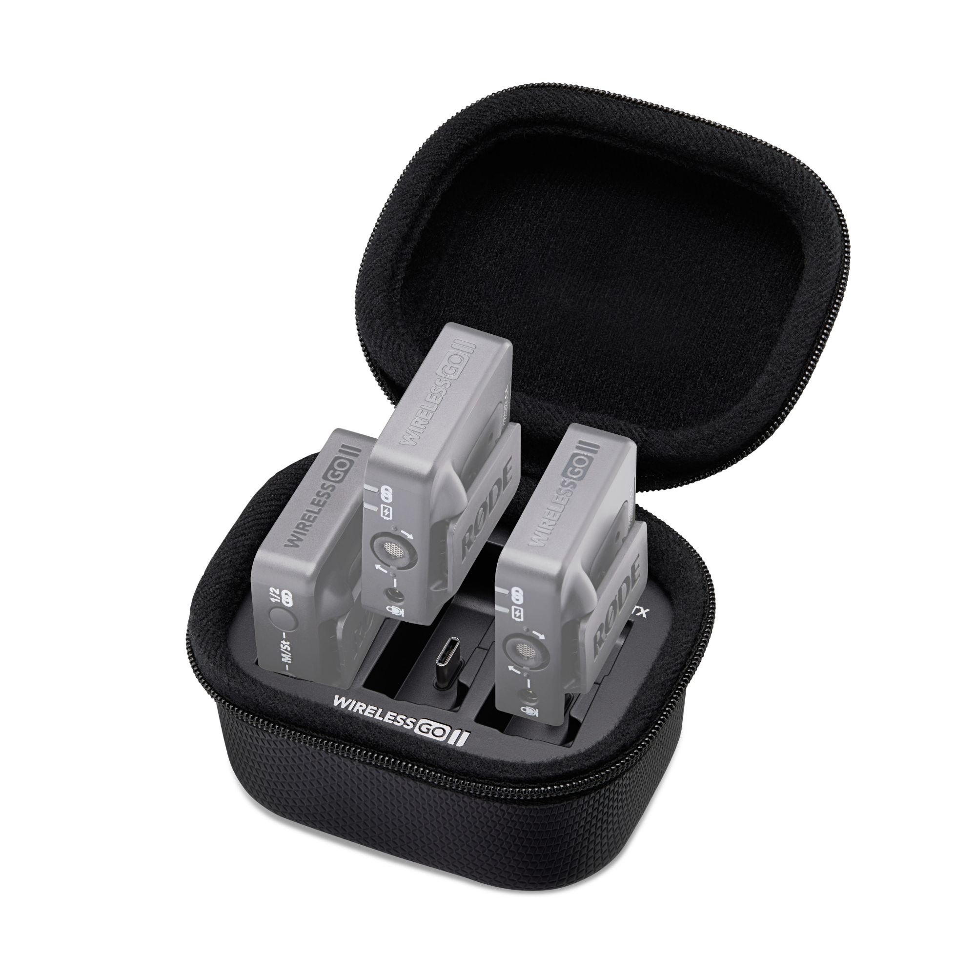 - Egyedi tervezésű töltő tok és hordtáska a Wireless GO II rendszer egységeinek tárolására és töltésére