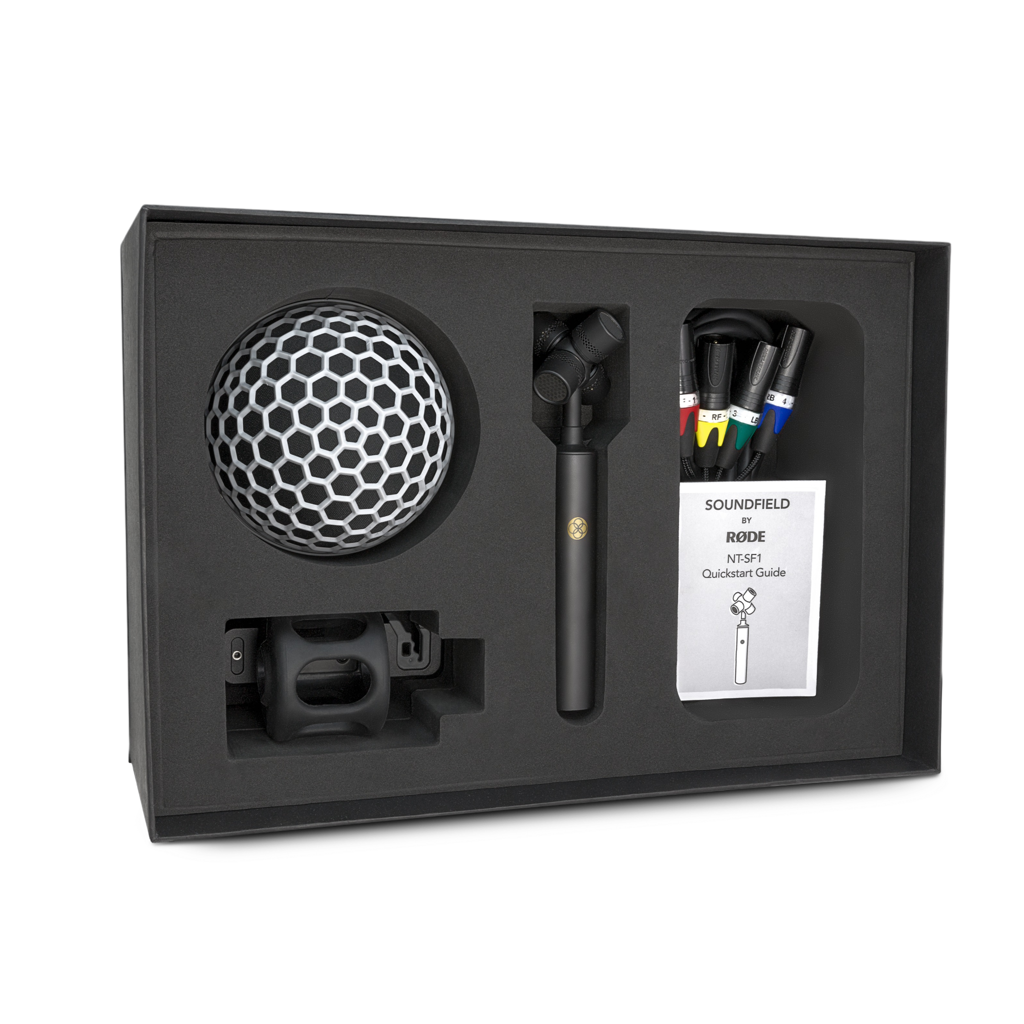 Az NT-SF1 mikrofont díszdobozban, alapkiszerelésben mellékelt, akusztikailag teljesen áteresztő szélfogó zeppelinnel, szőrös szélfogóval, rezgésgátló mikrofonfogóval és egy csúcsminőségű Mogami kifejtő kábellel együtt szállítja a RØDE.