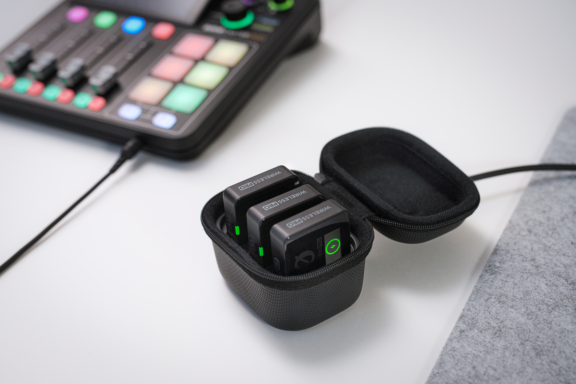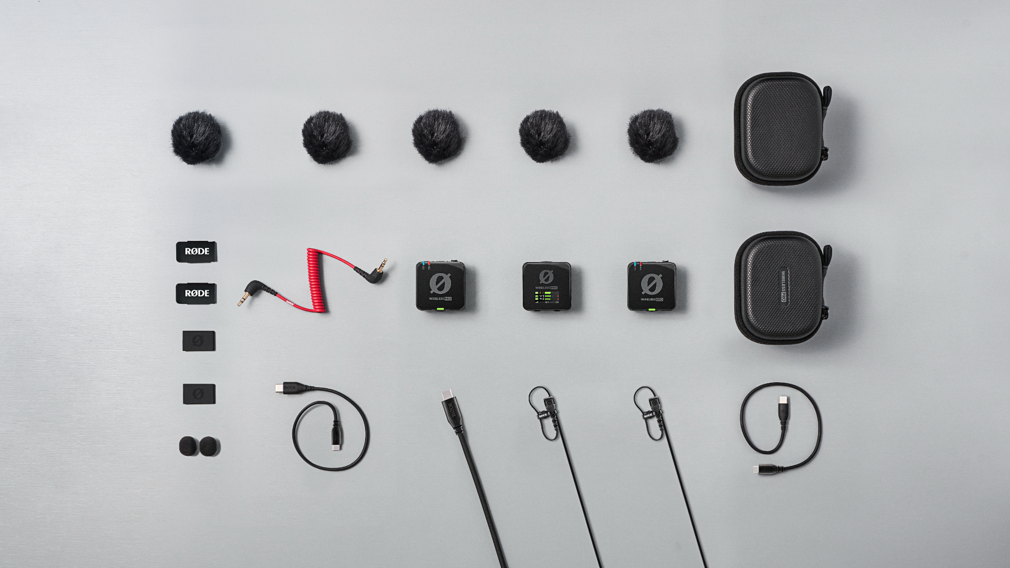 - Teljes tartozékkészlet az alapkiszerelésben, beleértve az intelligens töltőtáskát, két Lavalier II csíptetős mikrofont, kábeleket, MagClip GO mágneses mikrofonfogókat és tartozéktáskát